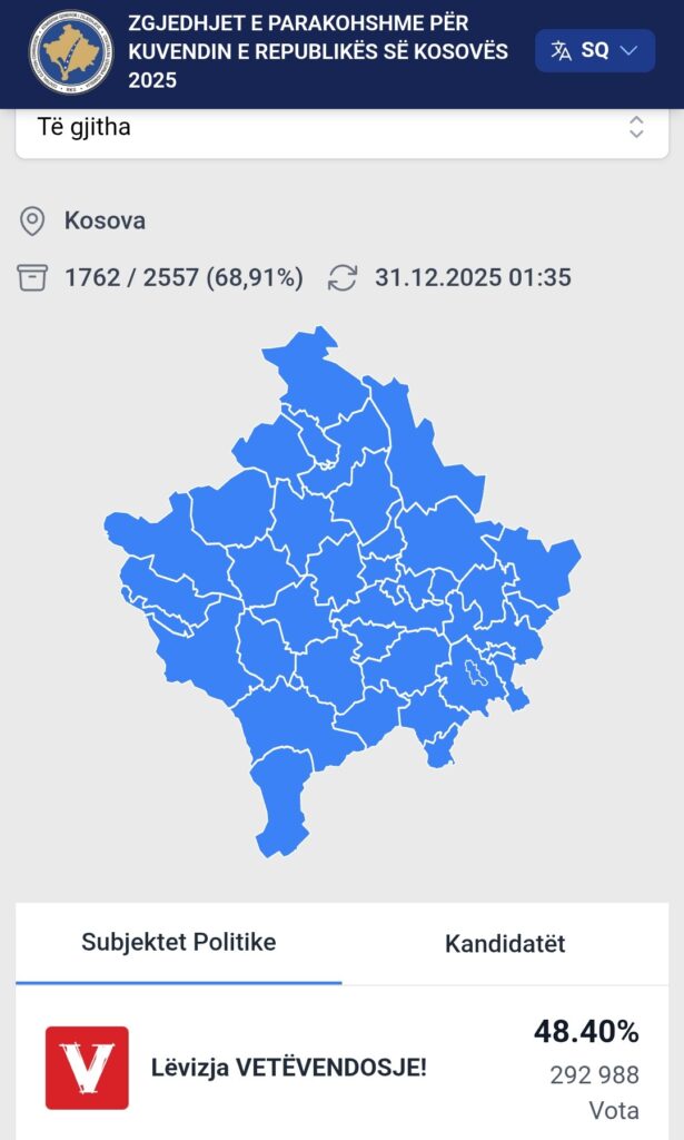 Kur janë numëruar afër shtatëdhjet përqind të votave për kandidatët për deputetë të subjekteve politike, për Vetëvendosjen janë numëruar 41.48 %.