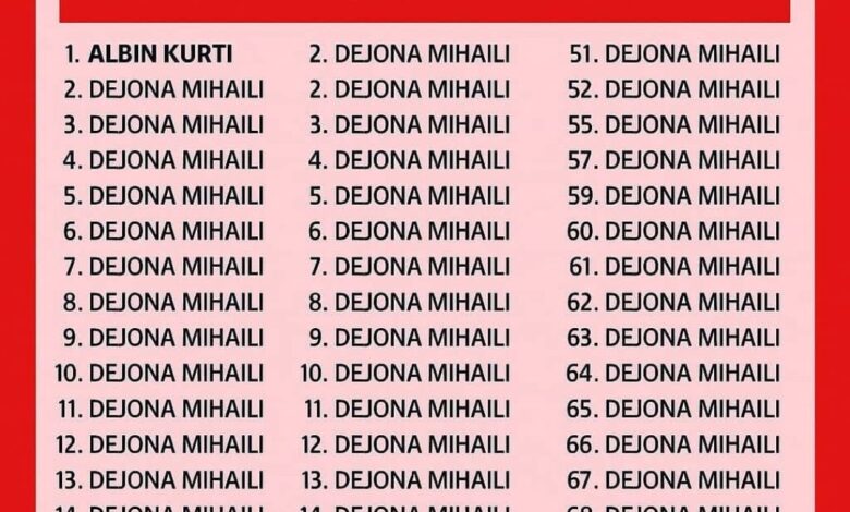 Nushi në listë të parin e ka Albin zkurtin, ndërsa të dytën dhe deri në 110, tashmë të përfolurën si komisare të LVV-së, Dejona Mihalin.