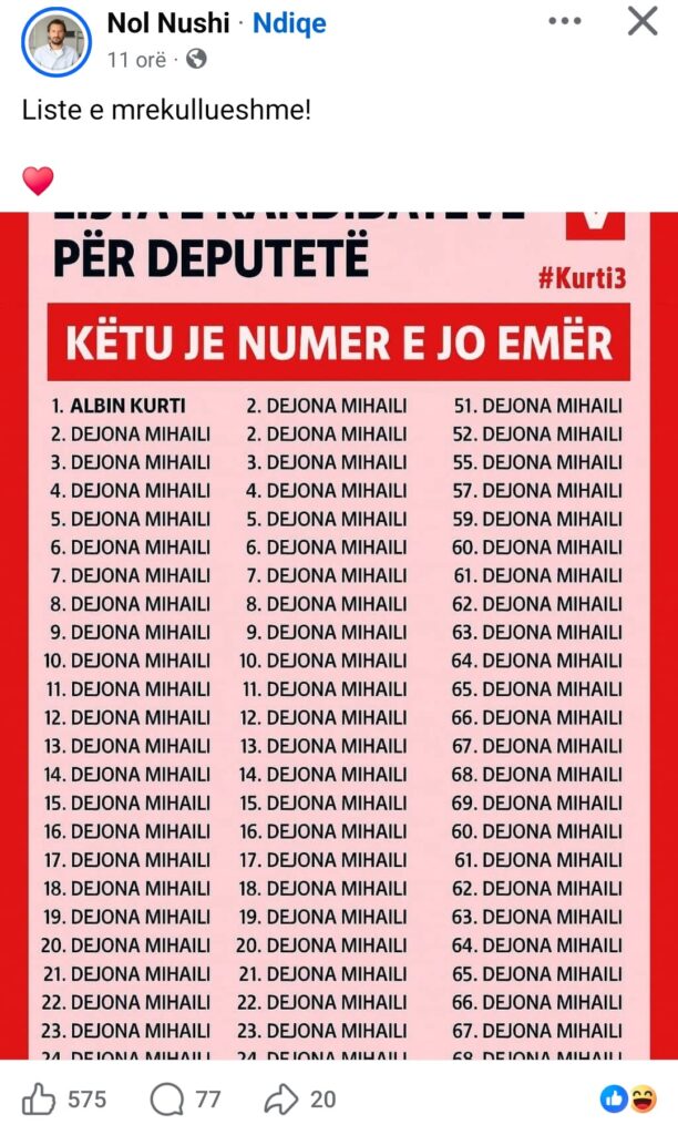 Nushi në listë të parin e ka Albin zkurtin, ndërsa të dytën dhe deri në 110, tashmë të përfolurën si komisare të LVV-së, Dejona Mihalin.