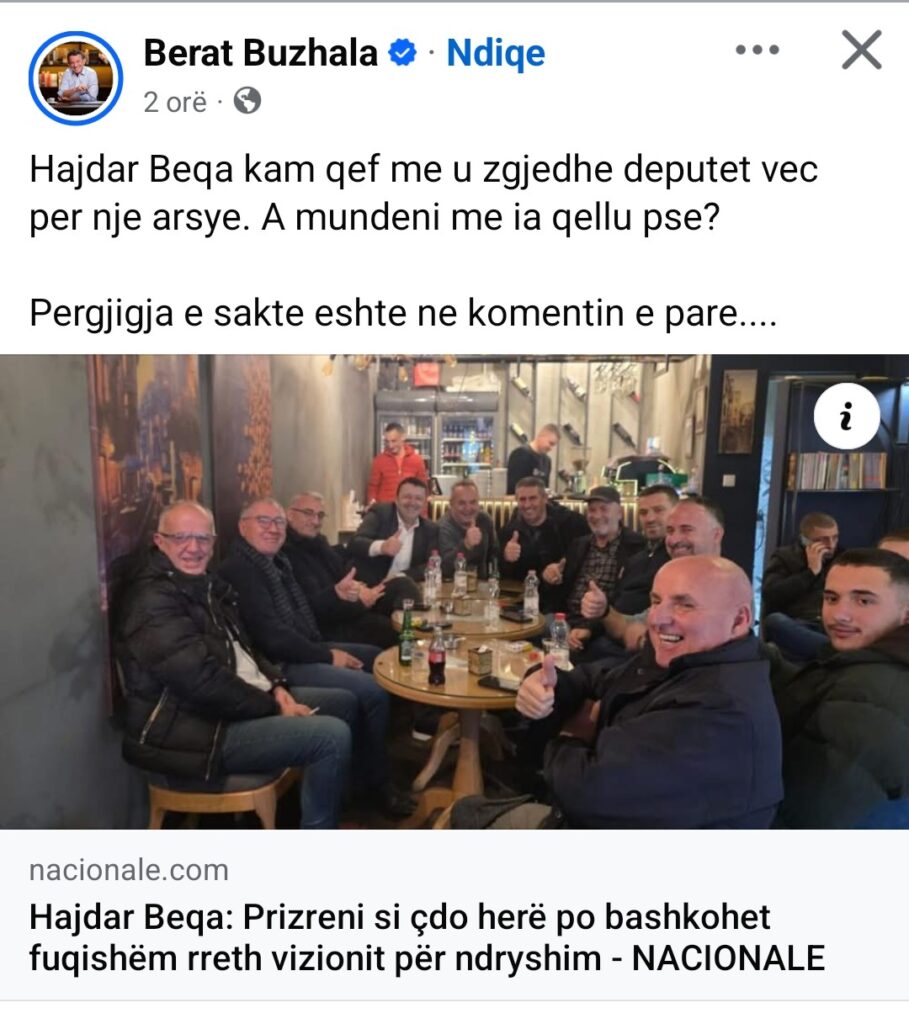 Ish-deputeti i Partisë Demokratike të Kosovës, Berat Buzhala, njëherit pronari i një mediumi, ka publikuar në adresën e tij publike në rrjetin social, Facebook, një lajm të Hajdar Beqës së PDK-së, me një mbishkrim se pse ai vetë dëshiron që ky kandidat të fitojë në zjedhjet nacionale të 28 dhjetorit.