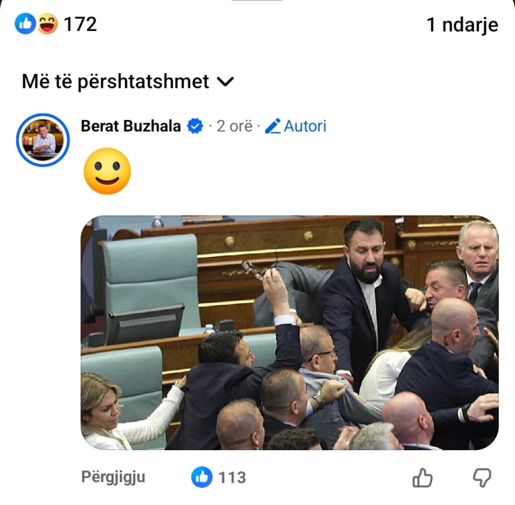 Deri këtu në rregull, por, në po këtë status ai ka shkruar, “përgjigjen e saktë e keni në komenti”, e kur të klikoni për të lexuar komentin e shihni këtë foton ku paraqitet dhuna në Kuvendin e Kosovës.