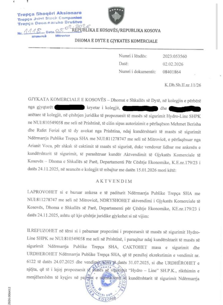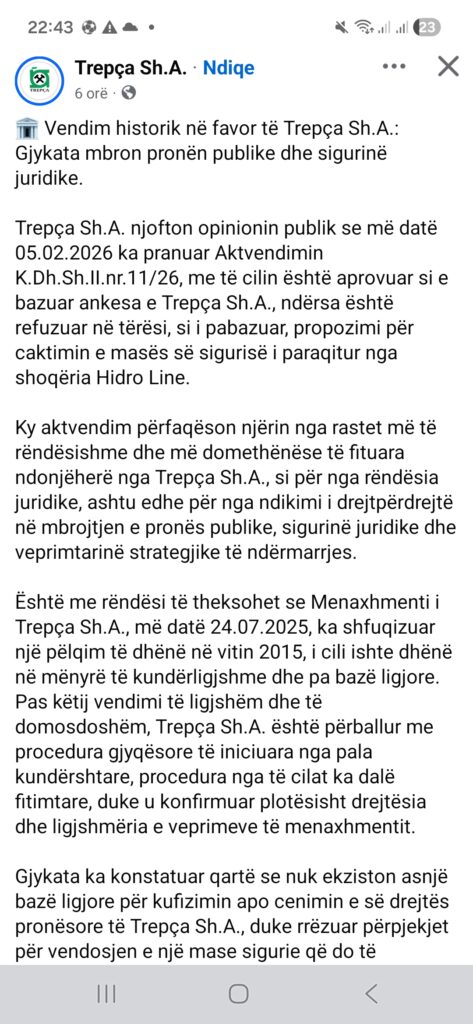 🏛️ Vendim historik në favor të Trepça Sh.A.: Gjykata mbron pronën publike dhe sigurinë juridike.Trepça Sh.A. njofton opinionin publik se më datë 05.02.2026 ka pranuar Aktvendimin K.Dh.Sh.II.nr.11/26, me të cilin është aprovuar si e bazuar ankesa e Trepça Sh.A., ndërsa është refuzuar në tërësi, si i pabazuar, propozimi për caktimin e masës së sigurisë i paraqitur nga shoqëria Hidro Line.Ky aktvendim përfaqëson njërin nga rastet më të rëndësishme dhe më domethënëse të fituara ndonjëherë nga Trepça Sh.A., si për nga rëndësia juridike, ashtu edhe për nga ndikimi i drejtpërdrejtë në mbrojtjen e pronës publike, sigurinë juridike dhe veprimtarinë strategjike të ndërmarrjes.Është me rëndësi të theksohet se Menaxhmenti i Trepça Sh.A., më datë 24.07.2025, ka shfuqizuar një pëlqim të dhënë në vitin 2015, i cili ishte dhënë në mënyrë të kundërligjshme dhe pa bazë ligjore. Pas këtij vendimi të ligjshëm dhe të domosdoshëm, Trepça Sh.A. është përballur me procedura gjyqësore të iniciuara nga pala kundërshtare, procedura nga të cilat ka dalë fitimtare, duke u konfirmuar plotësisht drejtësia dhe ligjshmëria e veprimeve të menaxhmentit.Gjykata ka konstatuar qartë se nuk ekziston asnjë bazë ligjore për kufizimin apo cenimin e së drejtës pronësore të Trepça Sh.A., duke rrëzuar përpjekjet për vendosjen e një mase sigurie që do të shkaktonte pasoja të rënda juridike, ekonomike dhe operative për ndërmarrjen.Çështja e pronës rregullohet shprehimisht me Ligjin për Pronësinë dhe të Drejtat Sendore, përkatësisht neni 18, i cili përcakton se pronari ka të drejtë të plotë të disponojë me pronën e tij dhe të përjashtojë të tretët nga çdo ndikim të paligjshëm. Në këtë kuptim, Trepça Sh.A., si pronare e pronës publike, gëzon të drejtën e plotë për të administruar dhe mbrojtur pronën e saj në përputhje me ligjet e Republikës së Kosovës.Po ashtu, kjo e drejtë mbrohet edhe nga neni 1 i Protokollit Shtesë të Konventës Evropiane për të Drejtat e Njeriut, i cili garanton respektimin e pasurisë dhe ndalon çdo privim arbitrar nga prona.Ky vendim gjyqësor përbën një precedent të fuqishëm juridik dhe dëshmon se asnjë interes privat dhe asnjë veprim i kundërligjshëm nuk mund të prevalojë mbi pasurinë publike dhe interesin strategjik të Trepça Sh.A.Trepça Sh.A. mbetet e vendosur në mbrojtjen e pronës së saj, interesit publik dhe funksionimit të pandërprerë të veprimtarisë minerare, duke shfrytëzuar të gjitha mjetet ligjore në dispozicion.
